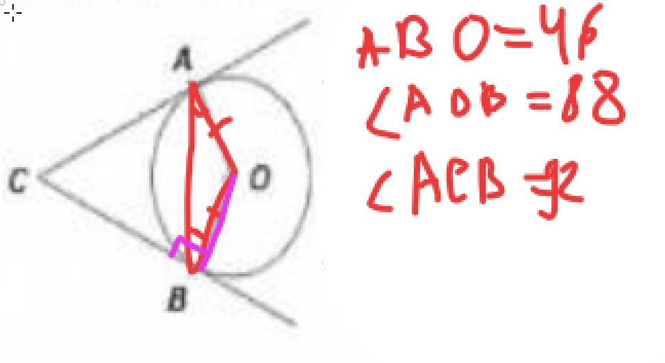 1. две прямые касаются окружностей с центром о в точках а и в Н пересекаются вт точке С. найдите угол между этими прямыми, если abo=46'.