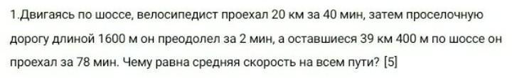 Двигаясь по шоссе, велосепедист проехал 20км за 40мин, затем проселочную дорого длиной 1600м он преодолел за 2мин, а оставшиеся 39км 400м по шоссе он проехал за 78мин. Чему равна средняя скорость на всем пути? дам 20 баллов