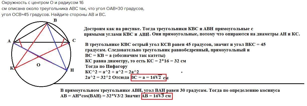 см описана около треугольника АВС так, что угол ОАВ=30 градусов, угол ОСВ=45 градусов. Найдите стороны АВ и ВС.