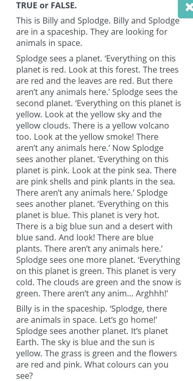 Сплодж видит планету. «Все на этой планете красное. Посмотри на этот лес. Деревья красные, а листья красные. Но животных здесь нет ». Сплодж видит вторую планету. «Все на этой планете желтое. Посмотрите на желтое небо и желтые облака. Есть еще желтый вулкан. Посмотри на желтый дым! Здесь нет никаких животных ». Теперь Сплодж видит другую планету. «Все на этой планете розовое. Посмотри на розовое море. В море розовые ракушки и розовые растения. Здесь нет никаких животных ». Сплодж видит другую планету. «Все на этой планете голубое. Эта планета очень горячая. Есть большое синее солнце и пустыня с голубым песком. И посмотри! Есть синие растения. Здесь нет никаких животных ». Сплодж видит еще одну планету. «Все на этой планете зеленое. Эта планета очень холодная. Облака зеленые, а снег зеленый. Животных нет ... Аааааааааааааааааааааааааааааа ...
