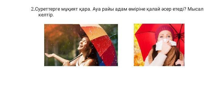 Ауа райы адамға өз әсерін тигізе алады.Мысалы:Қыста суықтап,ауырып қалуы.Жазда күн қатты ысып,бастан күн өту.Бұлардың барлығы адамға әсер етеді.Жаңбырдың астында жүре берсекте,суық тиіп қалуы мүмкін.Барлық ауа райы салқын болсын,ыстық болсын бұның бәрі адамға әсер етеді.