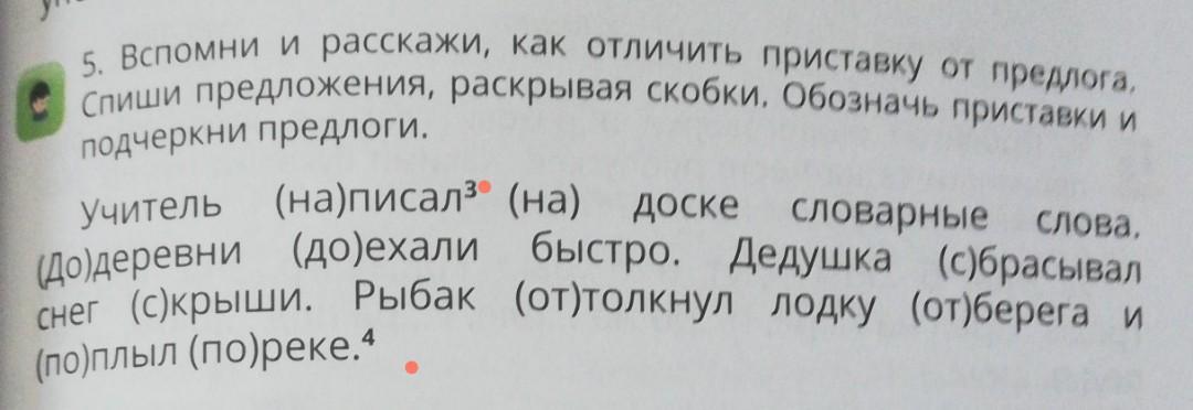 Учитель написал на доске словарные слова До деревни доехали Быстро дедушка сбрасывал снег с крыши Рыбак от толкнул лодку от берега и поплыл по реке