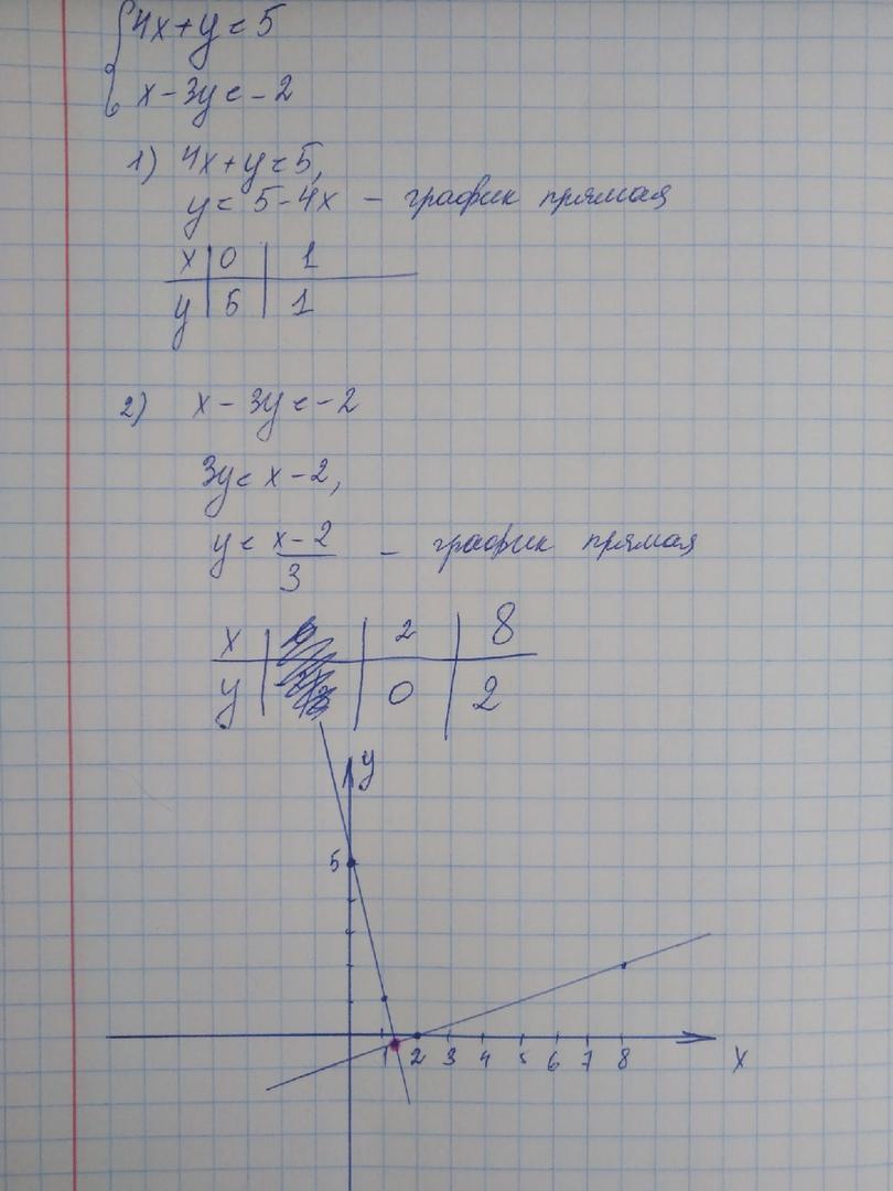 Выражаешь у из первой функции, строишь таблицу точек, строишь прямую. Выражаешь из второй функции у и делаешь то же самое. Ответ-точка пересечения графиков функций.