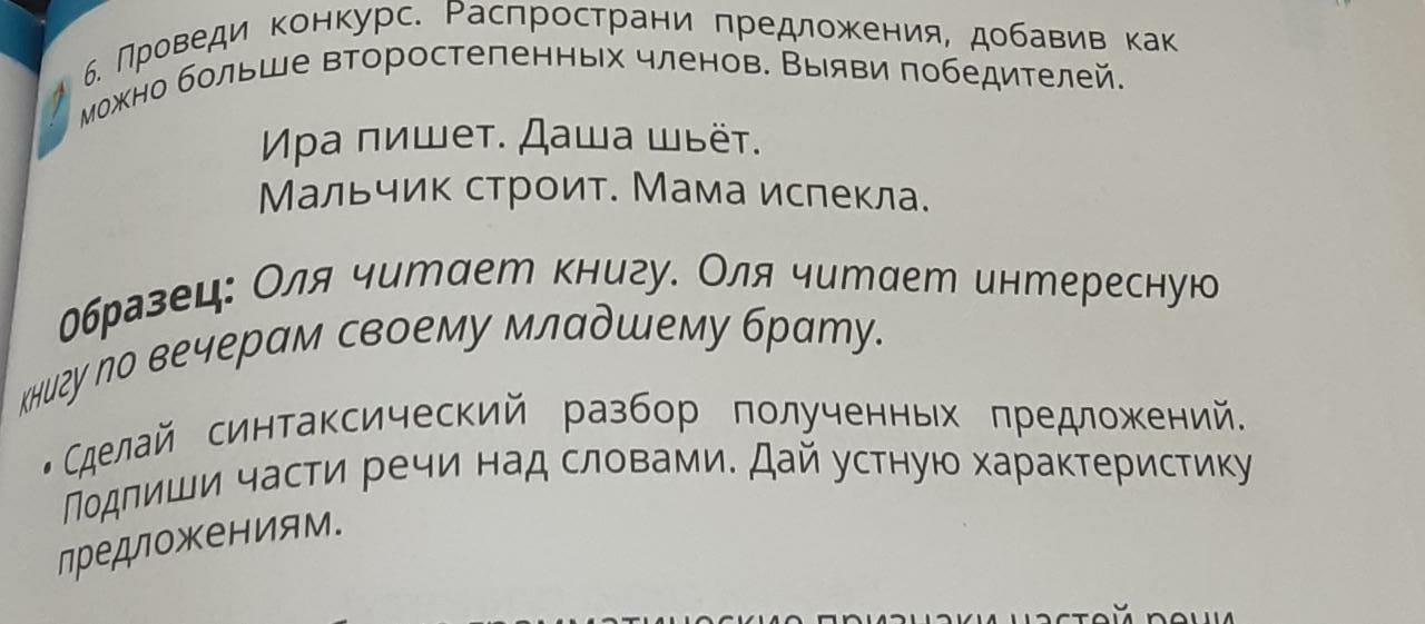 Ира(сущ) пишет(гл) в(предлог) тедради(обст) домашнее(прил) задание(сущ).