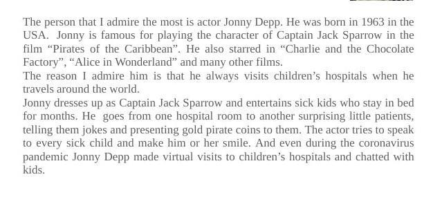 Johnny Depp was born on June 9, 1963. I admire his films. Johnny Depp is a great actor, the most popular role, of course, the role of Captain Jack Sparrow in "Pirates of the Caribbean". Johnny Depp spent $ 7 million on charity. Johnny Depp pleases young children by coming to them in the guise of the pirate Jack Sparrow.