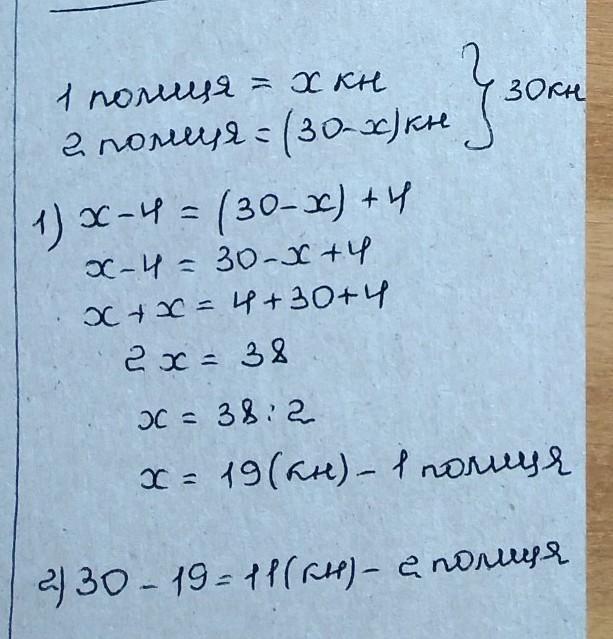 на двох полицях разом - 30 книжок. якщо переставити 4 книжки з першої полиці на другу , то книжок на полицях стане порівну. скількі книжок на кожній полиці?
