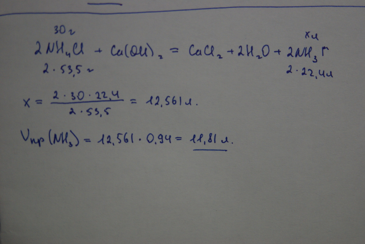 Вычислите объем аммиака который можно получить, нагревая 30 г хлорида аммония с избытком гидроксида кальция, приняв, что объемная доля выхода аммиака составляет 94%