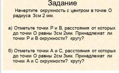 б) точки А и С лежат внутри окружности, так как расстояние от них до центра окружности меньше, чем радиус, то эти точки принадлежат только кругу, так как круг это плоская фигура, а окружности не принадлежат так как окружность это замкнутая кривая и точкой О в центре