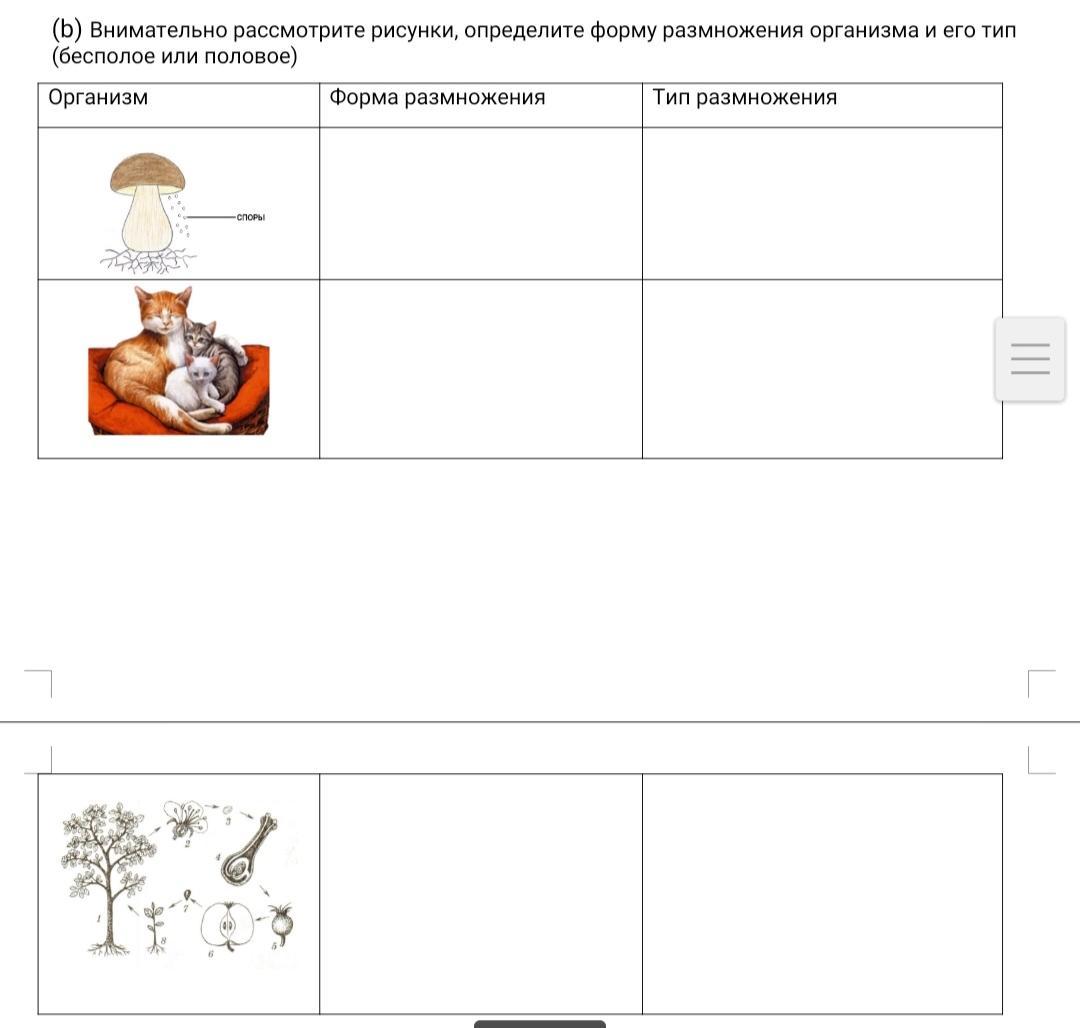 (b) Внимательно рассмотрите рисунки, определите форму размножения организма и его тип (бесполое или половое)