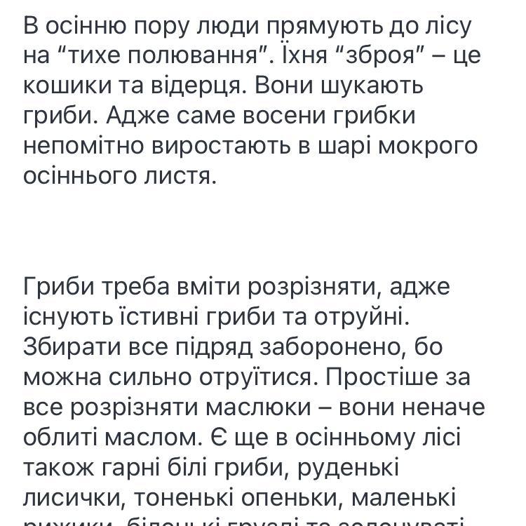 В осінню пору люди прямують до лісу на “тихе полювання”. Їхня “зброя” – це кошики та відерця. Вони шукають гриби. Адже саме восени грибки непомітно виростають в шарі мокрого осіннього листя.