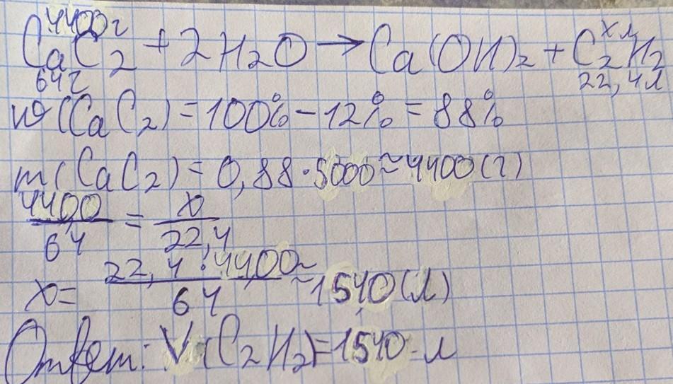Какой объем ацетилена (н.у.) можно получить при растворении в воде 5 кг карбида кальция, если массовая доля примесей в карбиде составляет 12%?