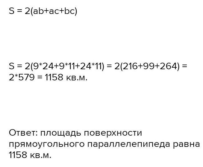 Ответ: S = 2(9*24+9*11+24*11) = 2(216+99+264) = 2*579 = 1158 кв. м. Ответ: площадь поверхности прямоугольного параллелепипеда равна 1158 кв