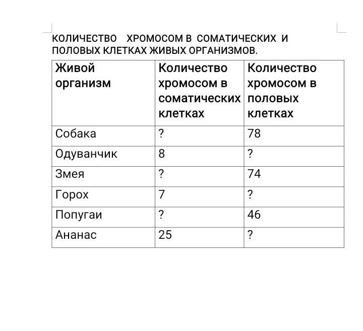 Определите количество хромосом в соматических и половых клетках различный живых организмов.