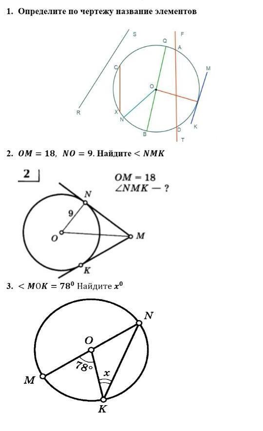 1) OТ, ОВ, ОQ-радиус, BQ- диаметр окружности, TF- секущая, КМ-касательная, SR- прямая не имеющая общих точек с окружностью