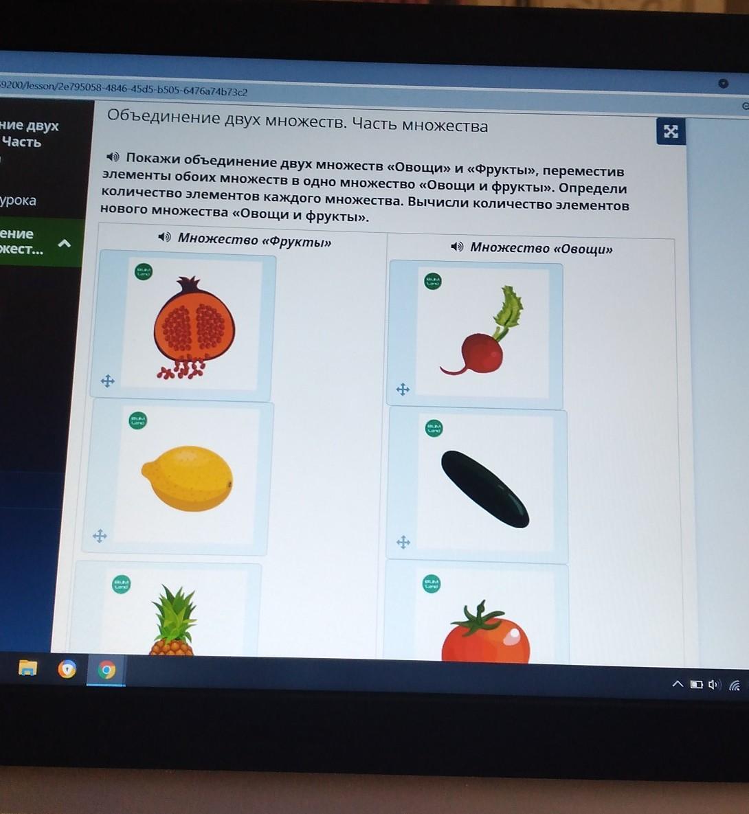 4) Покажи объединение двух множеств «Овощи» и «Фрукты», переместив