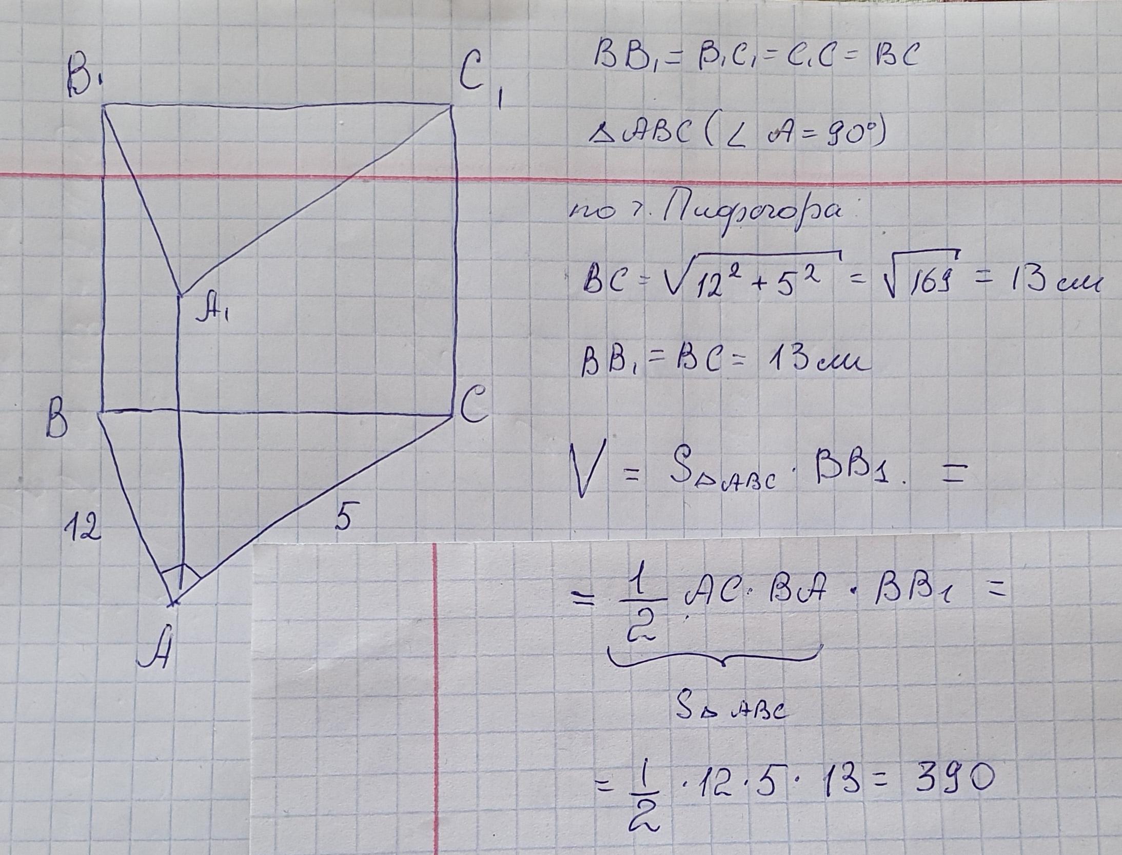 Основанием прямой призмы является прямоугольный треугольник АВС с катетами AB- 12 см, АС-5 см. Найдите объем призмы, если боковой грань CBB1C1-квадрат