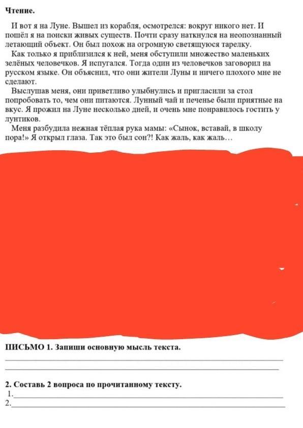 И вот я на Луне. Вышел из корабля, осмотрелся: вокруг никого нет. И пошёл я на поиски живых существ. Почти сразу наткнулся на неопознанный летающий объект. Он был похож на огромную светящуюся тарелку. Как только я приблизился к ней, меня обступили множество маленьких зелёных человечков. Я испугался. Тогда один из человечков заговорил на русском языке. Он объяснил, что они жители Луны и ничего плохого мне не сделают. Выслушав меня, они приветливо улыбнулись и пригласили за стол попробовать то, чем они питаются. Лунный чай и печенье были приятные на вкус. Я прожил на Луне несколько дней, и очень мне понравилось гостить у лунтиков. Меня разбудила нежная тёплая рука мамы: «Сынок, вставай, в школу пора!» Я открыл глаза. Так это был сон?! Как жаль, как жаль... ПИСЬМО 1. Запиши основную мысль текста.