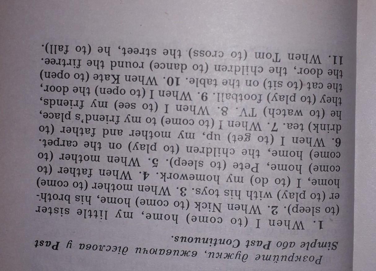 When I came home, my little sister was sleeping. 2. When Nick came home, his brother was playing with his toys. 3. When mother came home, I was doing my homework. 4. When father came home, Pete was sleeping. 5. When mother came home, the children were playing on the carpet. 6. When I got up, my mother and father were drinking tea. 7. When I came to my friend's place, he was watching TV. 8. When I saw my friends, they were playing football. 9. When I opened the door, the cat was sitting on the table. 10. When Kate opened the door, the children were dancing round the firtree. 11. When Tom was crossing the street, he fell.