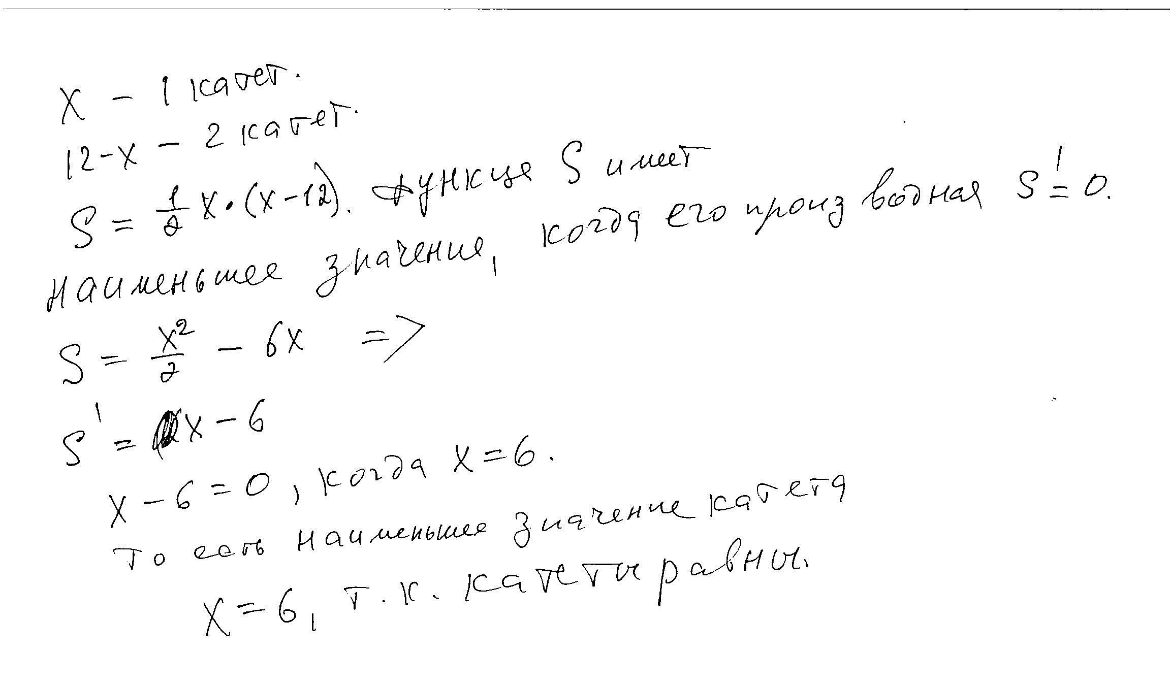 Сумма катетов прямоугольного треугольника равен 12 см. Какими должны быть катеты, чтобы площадь квадрата, построенного на его гипотенузе, была наименьшей?