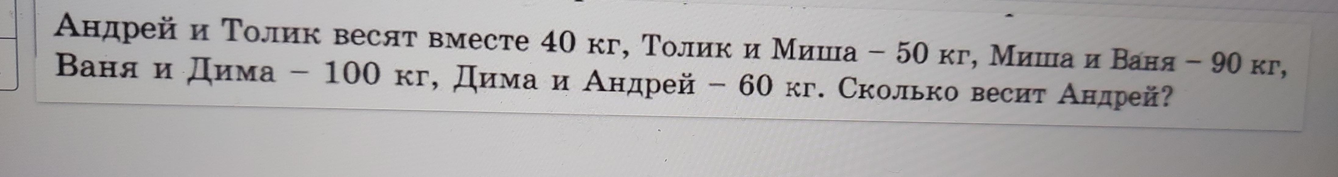 Обозначим вес каждого мальчика начальной буквой его имени, т.е. вес Андрея = А, вес Толи = Т и т.д. Получим уравнения: