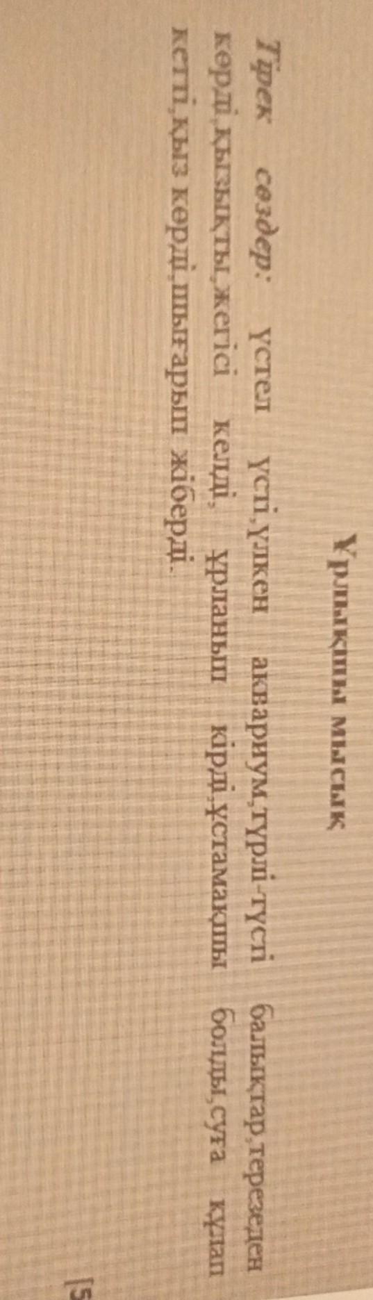 Ответ:Бөлмеде үстелдің үстінде үлкен аквариум тұр. Онда түрлі- түсті балықтар жүзіп жүр екен. Бір мысық түрлі- түсті балықтарды терезеден көрді. Оларға қарап қатты қызықты. Балықтарды жегісі келіп, ұрланып бөлмеге кірді. Аквариумге мініп, оларды ұстамақшы болды. Сол сәтте аяғы тайып суға құлап кетті. Суға құлаған мысықты қыз көрді. Ашуланып, судан мысық алып, сыртқа шығарып жіберді.