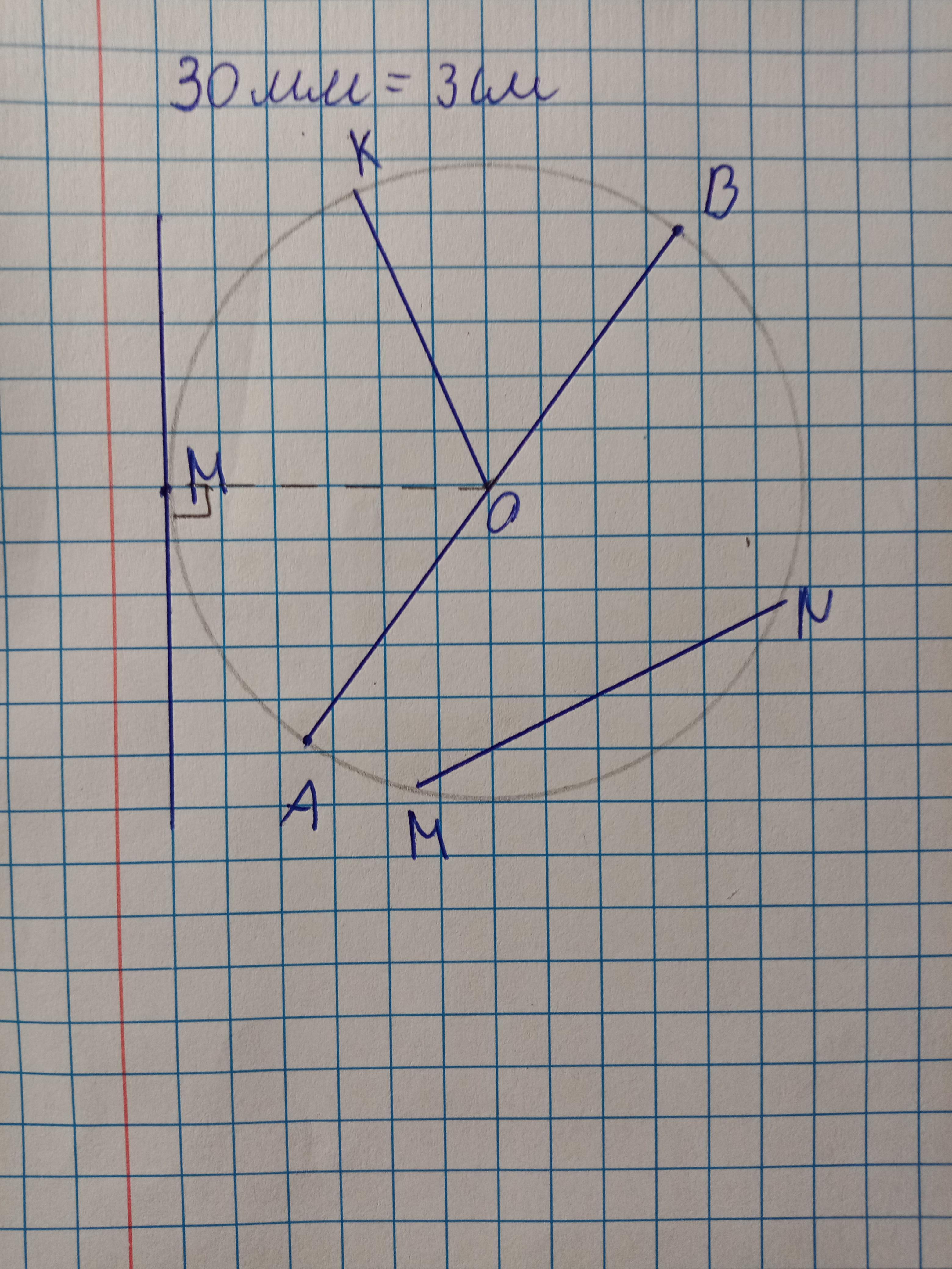 Накресліть коло радіуса 30 мм. Проведіть у ньому коло.1) діаметр AB; 2) хорду MN; 3) радіус OK; 4) дотичну через точку M