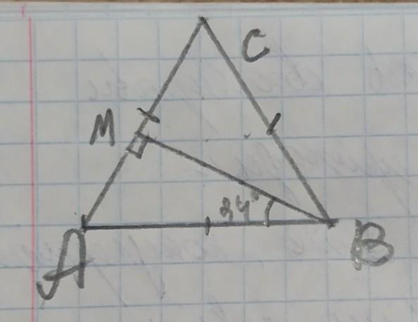 ∆ABM- прямокутний у прямокутному трикутнику сума гострих кутів прямокутного трикутника дорівнює 90° кут A=90°-34°=56°