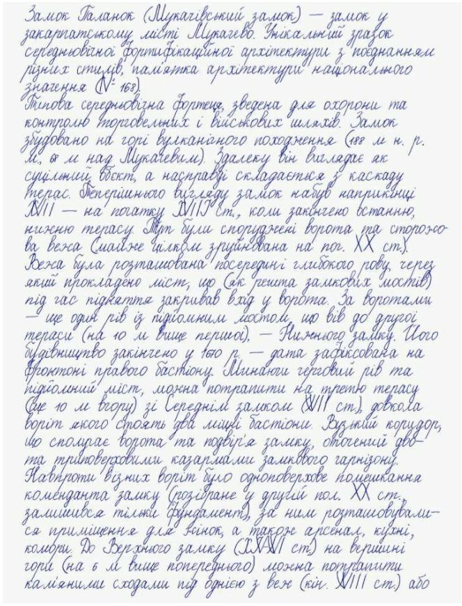 Типова середньовічна фортеця, зведена для охорони та контролю торговельних і військових шляхів.Замок збудовано на горі вулканічного походження (188 м н.р.м, 68 м над Миколаєвим).Здалеку він виглядає як суцільний об'єкт , а насправді складається з каскаду терас.Теперішнього вигляду замок набув наприкінці 17-на початку 18 ст, коли закінчено останню нижню терасу.Тут були споруджені ворота та сторожова вежа (майже цілком зруйнована на початку 20 ст).Вежа була розташована посередині глибокого рову, через який прокладено міст, що (як решта замкових мостів) під час підняття закривав вхід у ворота.За воротами - ще один рів із підйомним мостом,що вів до другої тераси (на 10 м вище першої) -Нижнього замку. Його будівництво закінчено у 1610 р-дата зафіксована на фронтоні правого бастіону.Минаючи черговий рів та підйомний міст, можна потрапити на третю терасу (ще 10 м вгору) за Середнім замела (?? Ст) довкола воріт якого стоять два міцні бастіони.Вузький коридор,що сполучає ворота та повір'я замку оточений двома триповерховими казармами замкового гарнізону.Навпроти від цих воріт було одноповерхове помешкання коменданта замку (розібране у другій половині 20 ст. Залишився тільки фундамент) за ним розташовувалися приміщення для жінок, а також арсенал, кухні,комори.До Верхнього замку (?? Ст) на вершині гори (на 6 м вище попереднього) можна потрапити кам'яними сходами під однією з веж (кінця ?? Ст) або через так званий хід-пастку кінця 17 ст. Колись сюди ж вів потаємний хід.Саме в князівських палатах (16-17ст.) Що оточують подвір'я, мешкали власники Мукачівського замку.Також у південно-східній частині розміщувалася замкова церква.