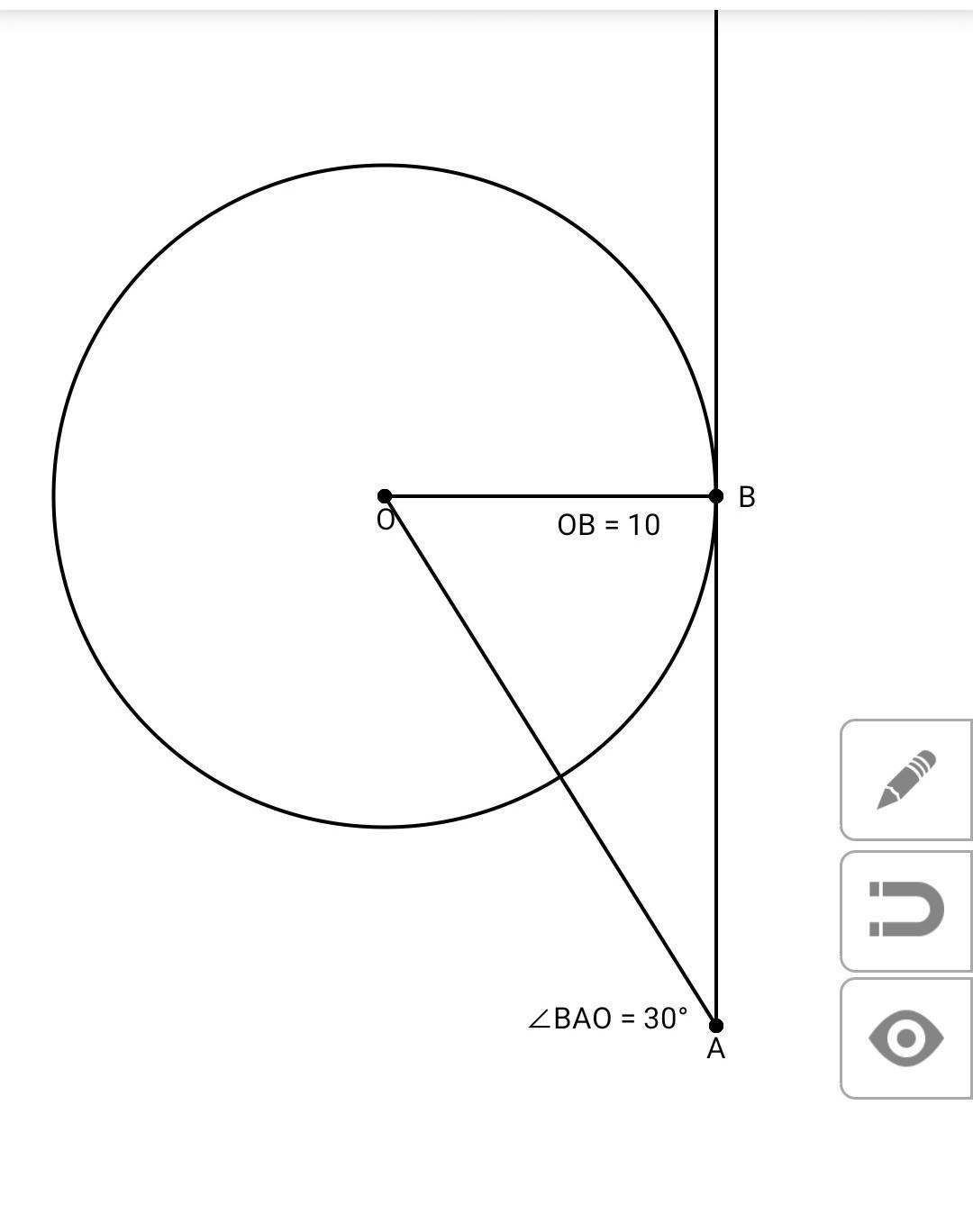Из точки А к окружности через точку В проведена касательная. Радиус окружности равен 10 см. О-центр окружности. Угол ВАО=30°. Найдите АО