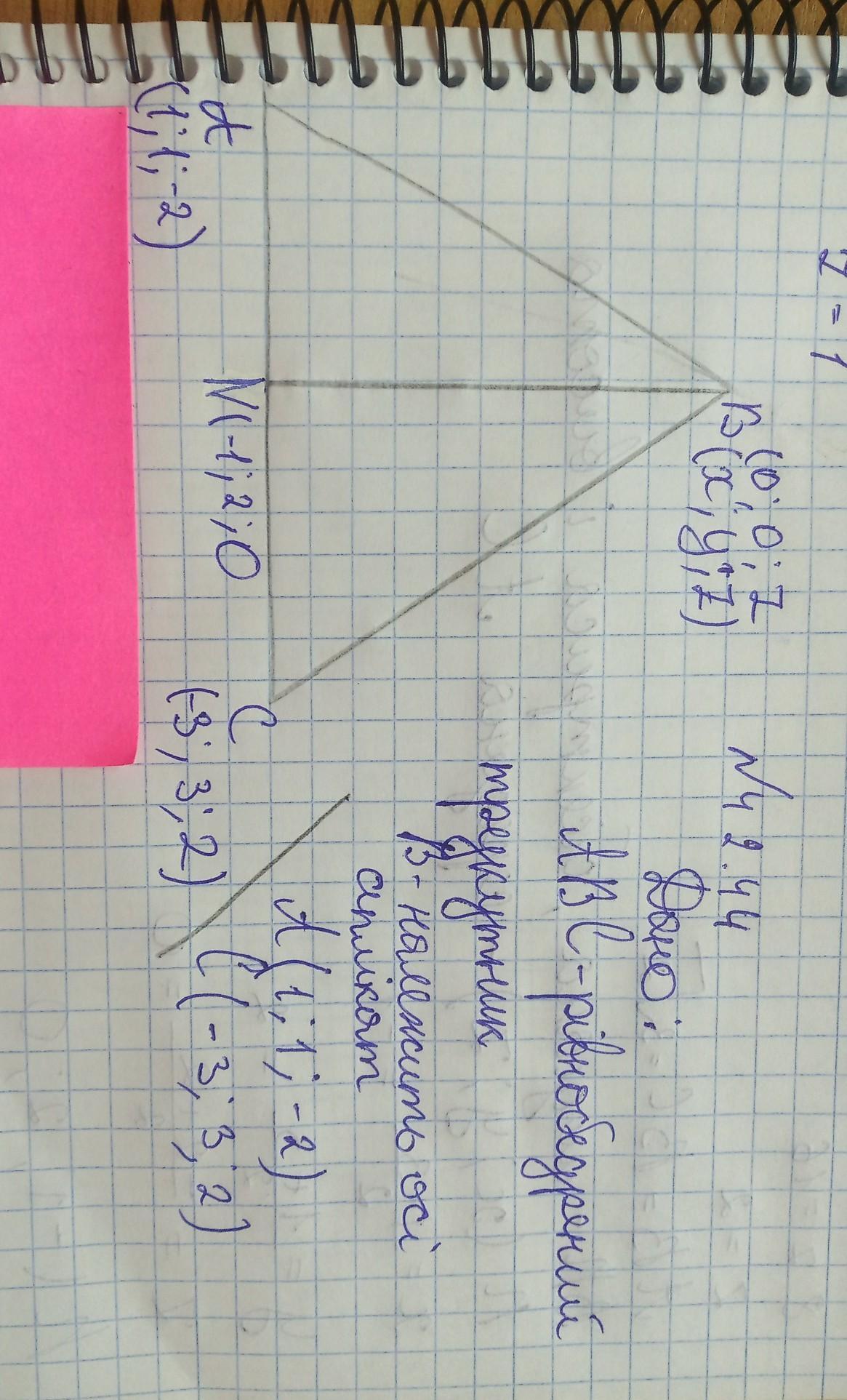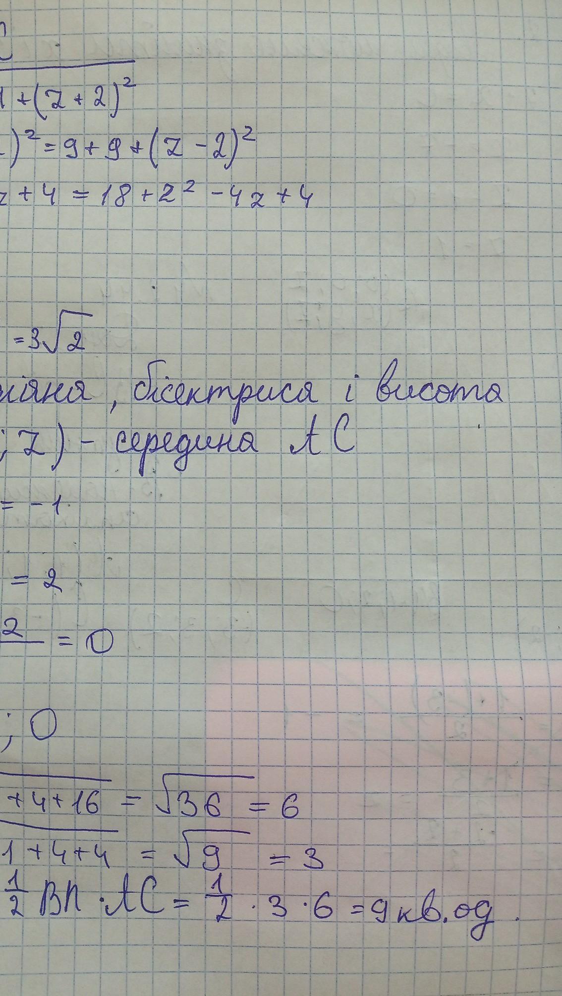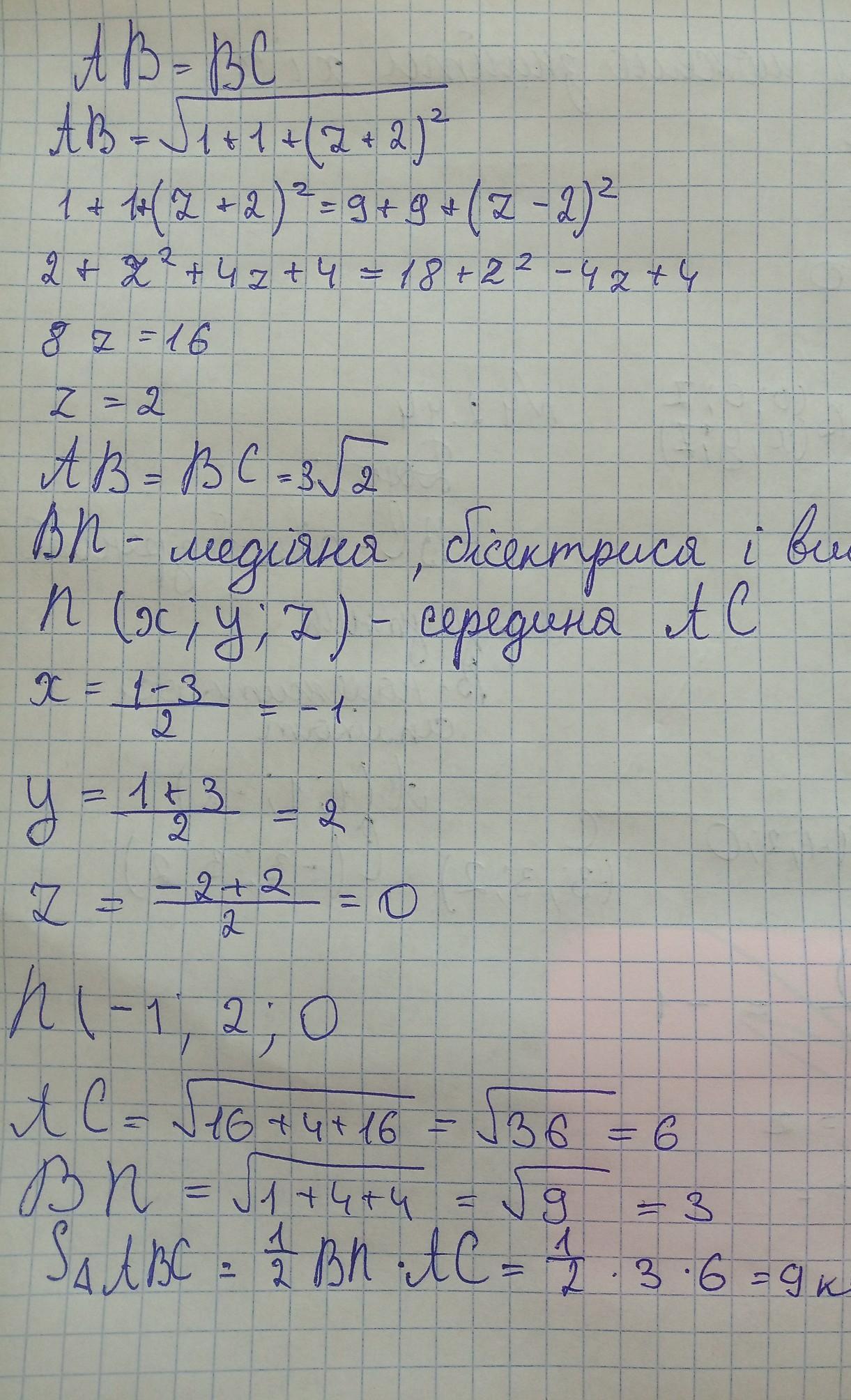 Знайдіть площу рівнобедренного трикутника АВС з основою АС, якщо відомо, що А (1;1;-2) , С (-3;3;2), а точка В належить осі аплікат.