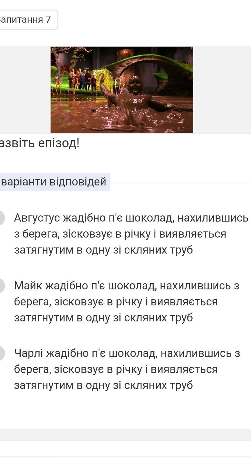 Августус жадібно п'є шоколад нахилившись з берега , зісковзує в річку і виявляється затягнутим в одну зі скляних труб