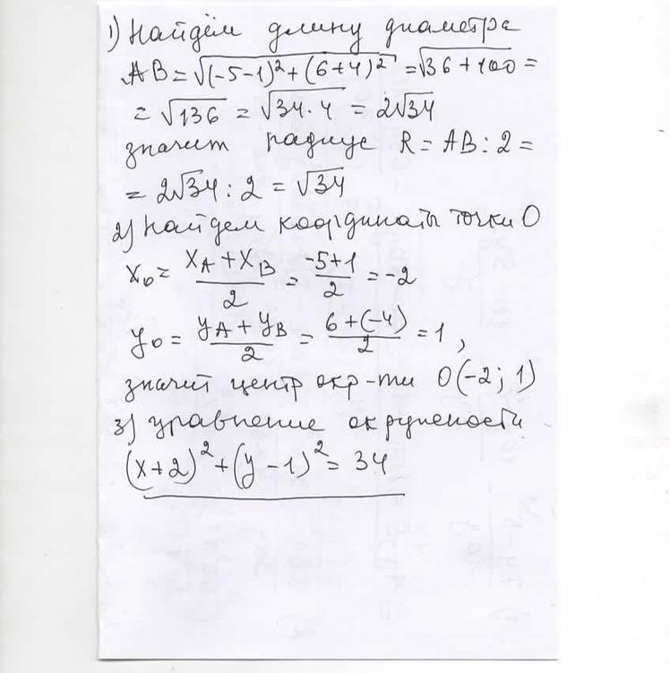AB-диаметр окружности с центром О. Если координаты точек А и В равны (-5;6) и (1;-4) соответственно, создайте уравнение окружности.