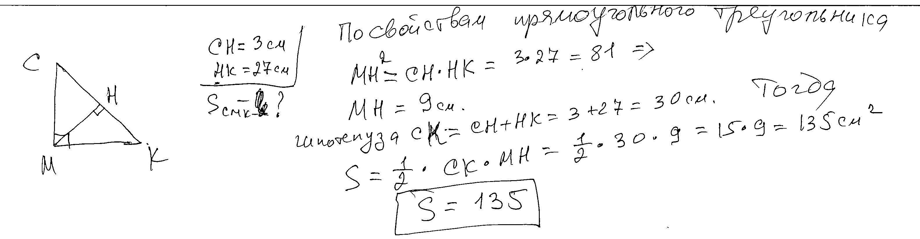 Срочно МН-висота, проведена прямогокута трикутника СМК. Знайти площу трикутника, якщо СН=3см, НК=27см. ( Відповідь записати тільки цифрою, без одиниць виміру)