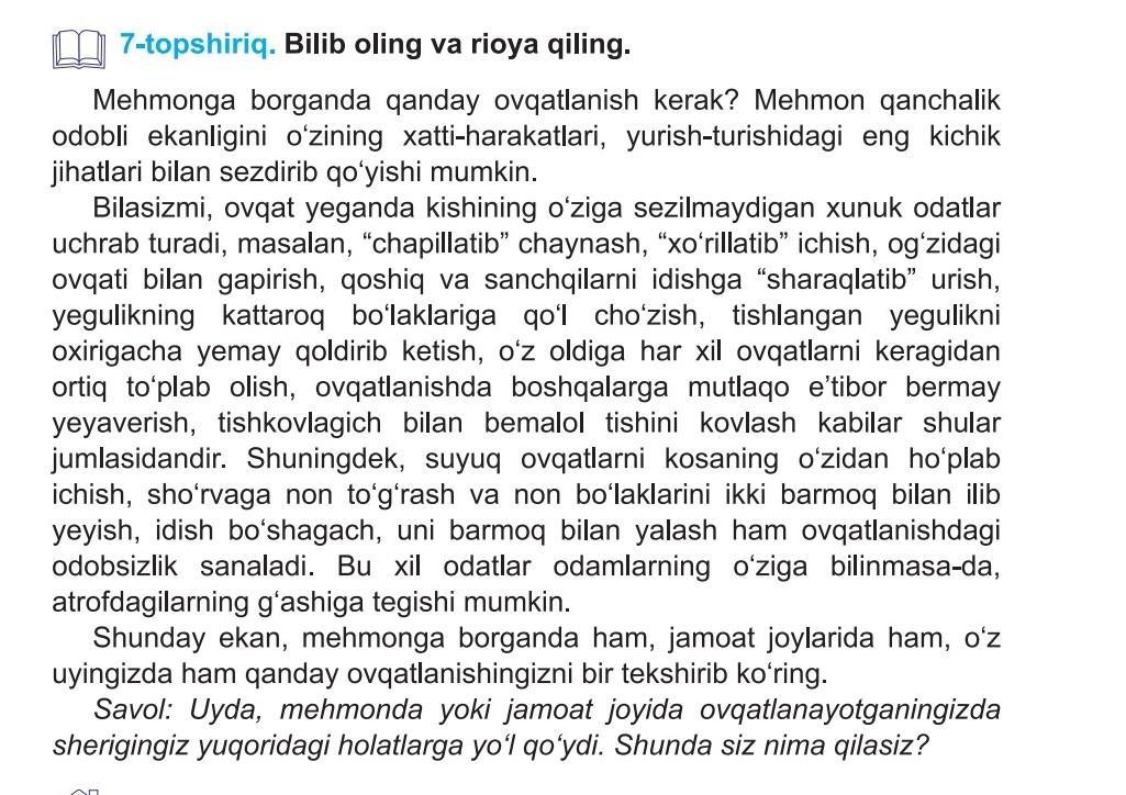 javob: bunday xolda men sherigimga mehmondorchilikda yoki jamoat joyida ovqatlanish odobini yana bir bor eslatib qoygan bolar edim.