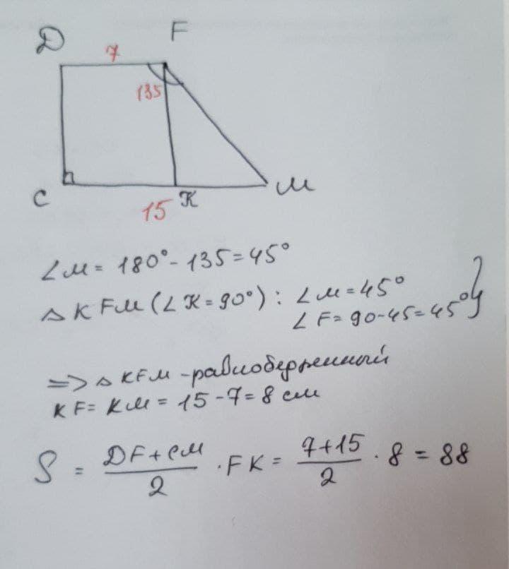 Срочно У прямокутній трапеції CDFM( кут С=90 градусів) Основи дорівнюють СМ=15см, FD= 7см, Знайти площу трапеції, якщо її тупий кут дорівнює 135 градусів.