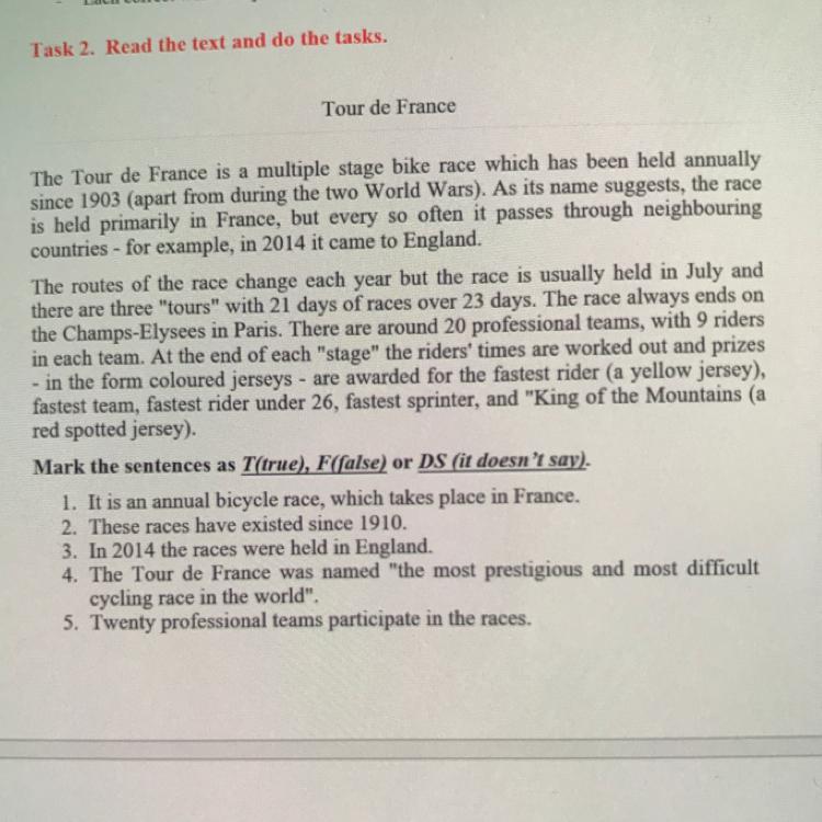 Mark the sentences as T(true), F(false) or DS (it doesn't say).