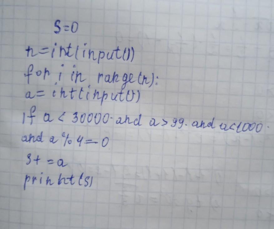 должна вывести одно число: сумму трехзначных чисел кратных 4
