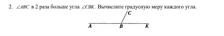 Угол ABK = 180 градусов, поделим его на три части и для угла ABC возьмем 2 части, а для CBK - одну, чтобы получилось в два раза меньше