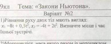 рівняння двох тіл мають вигляд: x1=8t+0,5t^2 x2=-4t2t^2 визначье місце і час їхньої зустрічі