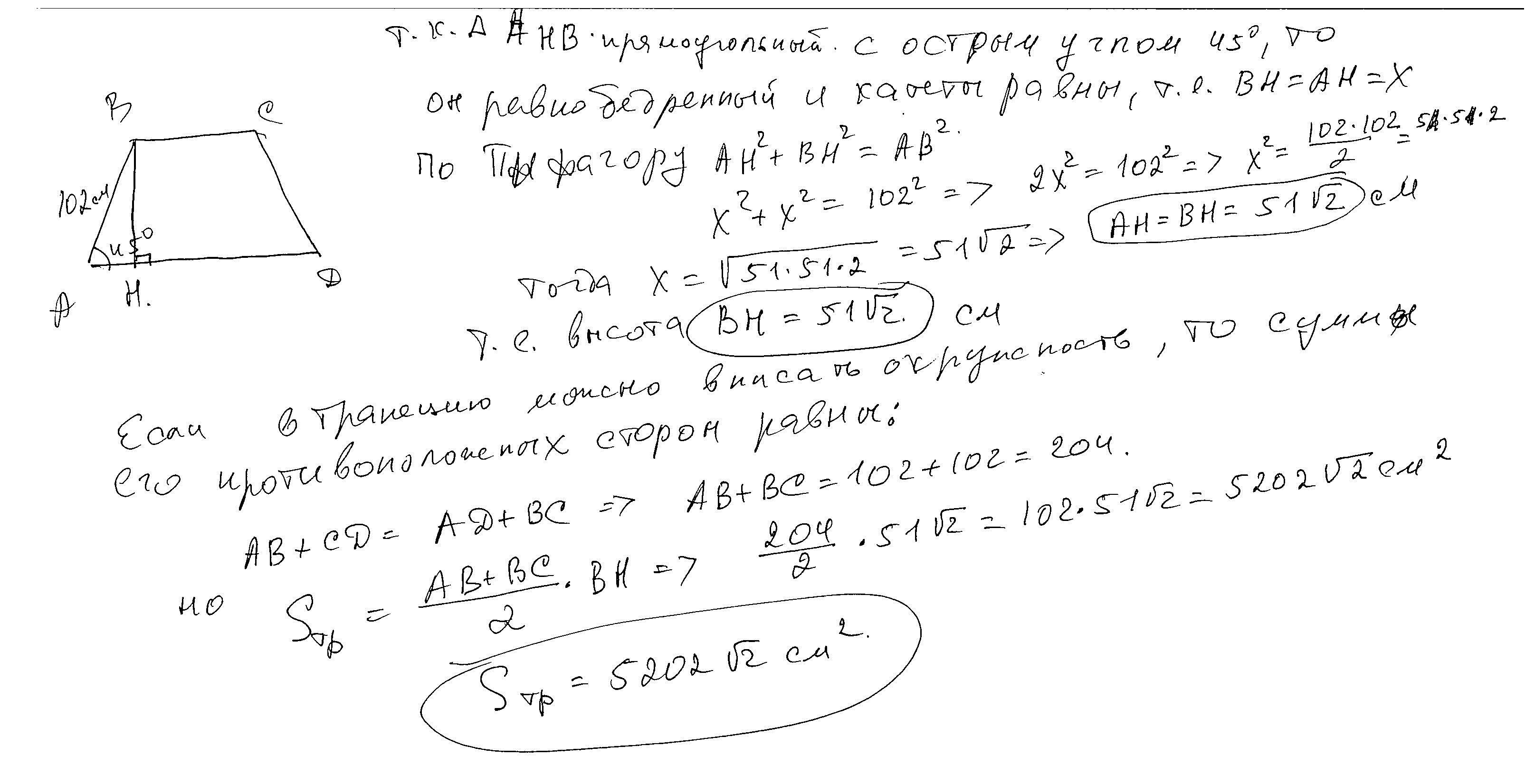 основою кут 45°. Знайдіть площу трапеції, якщо в неї можна