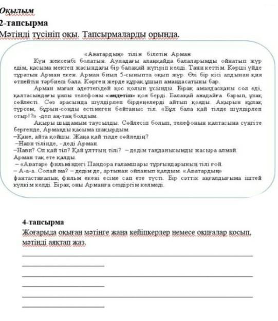 Ответ:Арманнын қасына тағы бір ұл жүгіріп келді. Арман қайтадан Аватар тілімен сөйлей кетті. Тұрып тұрып қастарына жақындадым да мені Аватар тіліне үйретіндерші дедім. Олар күліп жақсы, жүр кеттік. Менің үйімде отырып үйретерміз деді, мен құанып арттарын еріп бардым. Келген соң Арманнын досын шақырып атын сұрадым ол маған менің атым Мансур Арман мен бірге оқимін деді. Мен айтарымды білмей таңдалып қалдым қалай осындай ұзын бойлы бала Арман мен бірге оқиді деп тұрып қалдым. Жақсы болар іс бітті кеттік Аватар тіліне үйренем деп сағат 10:00 ден бастап сағат 18:00 ге дейін 30 шақты сөзге үйрендім. Маған қатты ұнады!!!