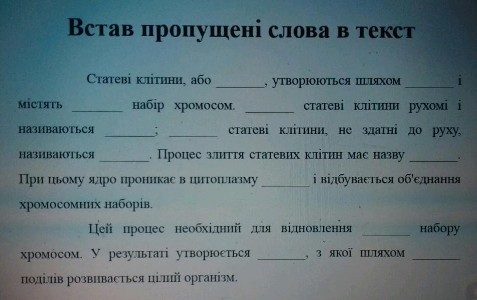 Ответ:1. Гамети 3. Гаплоїдний 5. Сперматозоїди 4. Чоловічі
