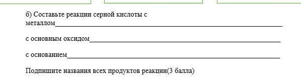 1)Н2SO4+Zn- ZnSO4+H2 (сульфат цинка и водород) 2)H2S04+CaO-CaSO4+H20(сульфат кальция и вода) З)H2SO4+2NaOн-Na2S04+2H20(сульфат натрия и вода)