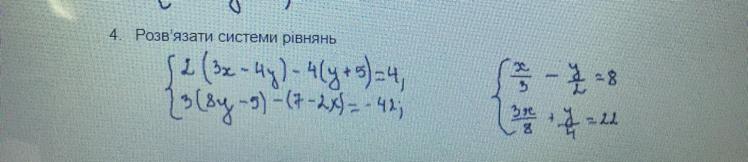 2(3x - 4y) - 4(y + 5) = 4 \\ 3(8y - 5) - (7 - 2x) =  - 42 \\  \\ 6x - 8y - 4y - 20 = 4 \\ 24y - 15 - 7 + 2x =  - 42 \\  \\ 6x - 12y = 24 \\ 2x + 24y =  - 20 \\ 6x - 12y = 24 \\ x + 12y =  - 10 \\ 7x = 14 \\ x = 2 \\ 6 \times 2 - 12y = 24 \\  - 12y = 24 - 12 \\  - 12y = 12 \\ y =  - 1