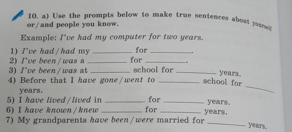 10. а) Use the prompts below to make true sentences about yourself or / and people you know.