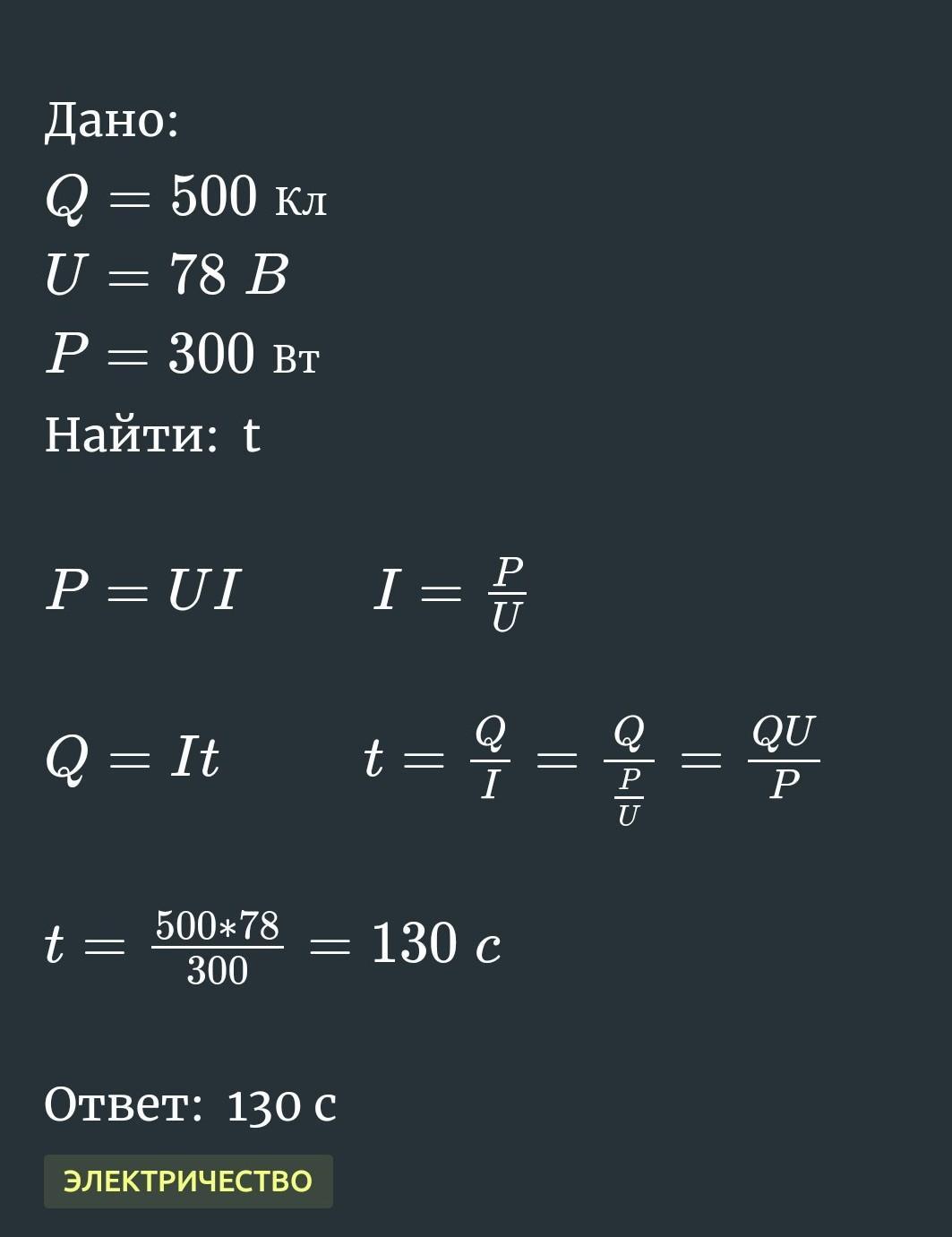 2. Сколько времени течет заряд 500 Кл по проводнику мощностью 300 Вт и напряжением 78 В?