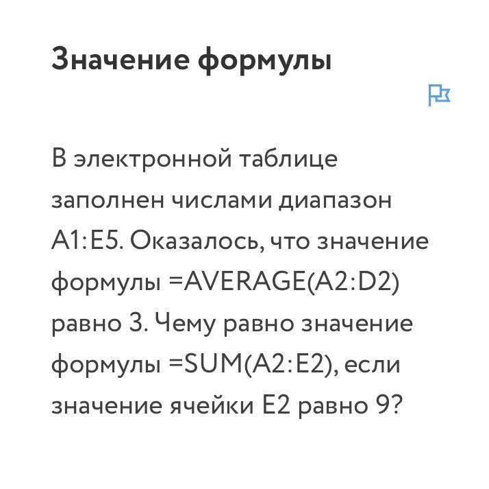 В электронной таблице заполнен числами диапазон A1:E5. Оказалось, что значение формулы =AVERAGE(A2:D2) равно 3. Чему равно значение формулы =SUM(A2:E2), если значение ячейки E2 равно 9?