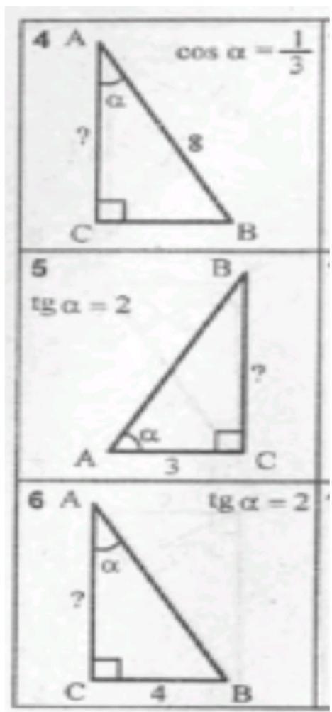 Объяснение:4) зная что cos равен отношению прилежащего катета к гипотенузе задача решается просто cosA= AC/8=1/3 тогда AC= 8/3 5) тангенс это отношение противолежащего катета к прилежащему tgA=BC/3=2 тогда BC=6 ; 6) аналогично 5 заданию tgA=4/AC =2 тогда AC=2