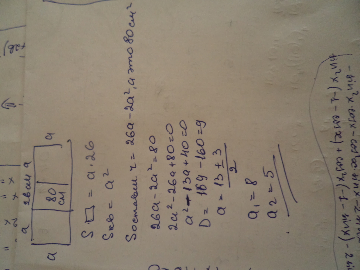 От прямоугольного листа картона длиной 26 см отрезали с двух сторон квадраты сторона каждого из них равна ширине листа .Площадь оставшейся части равна 80 см в квадрате .Найдите ширину листа картона .Покажите что задача имеет два решения.