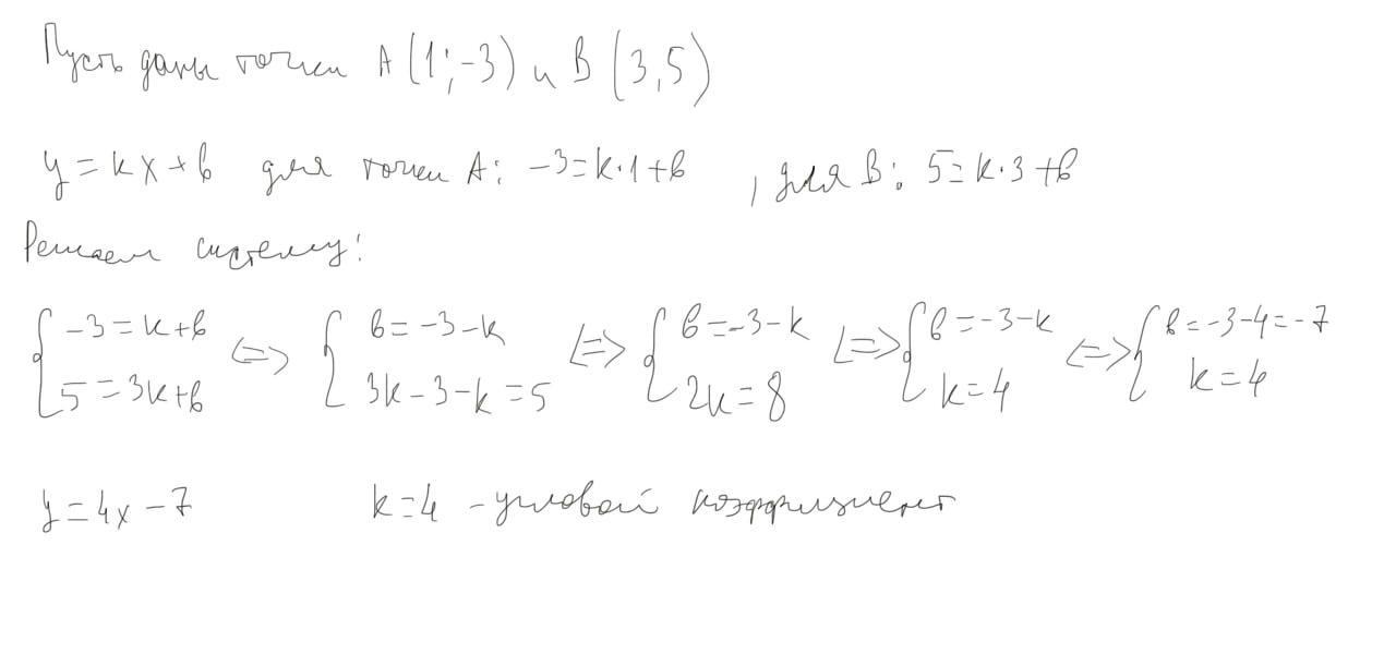 Прямая проходит через точки (1,-3),(3,5). Нужно найти угловой коэффициент этой прямой.